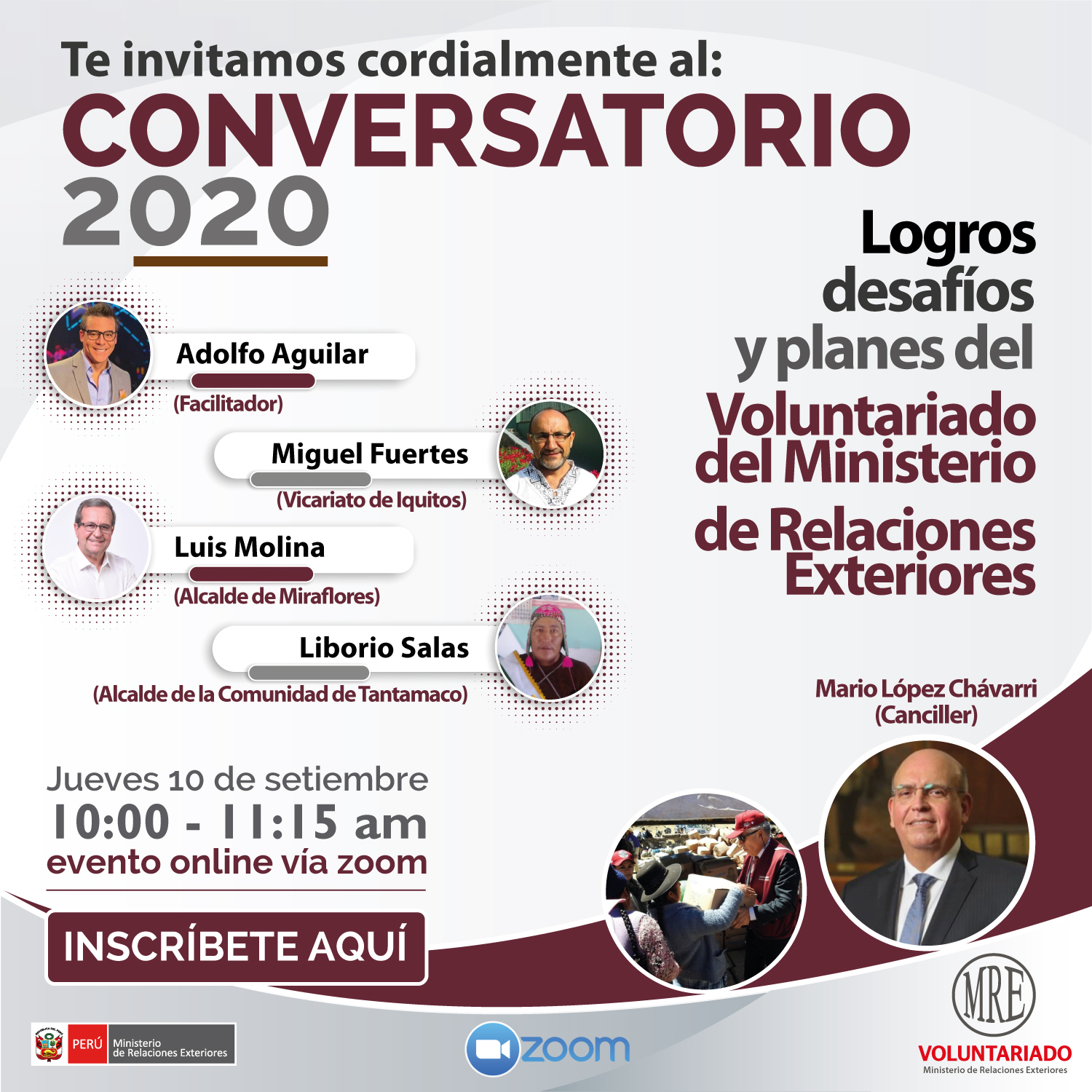 El jueves 10 de setiembre se realizará el conversatorio virtual 2020, se invita a todo el personal del Ministerio de Relaciones Exteriores a su participación.