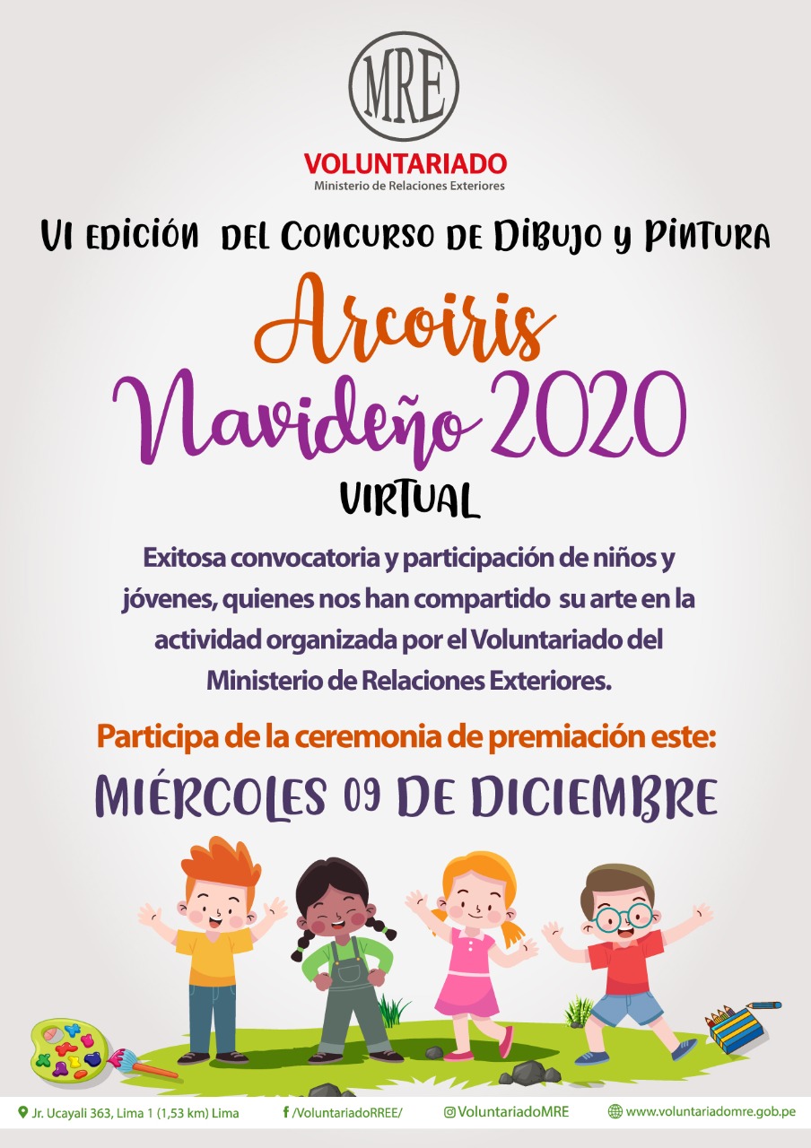 Niños y jóvenes expresan su talento y creatividad en el concurso de dibujo y pintura "Arcoíris Navideño 2020”, el certamen cuenta con la participación de los hijos del personal del MRE que laboran en diferentes dependencias, así como en las misiones, representaciones y consulados del Perú.