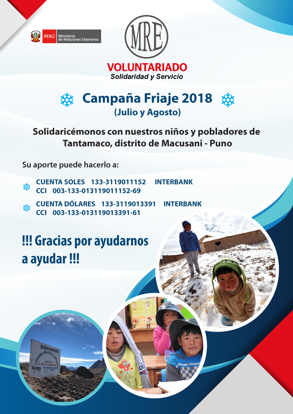 Del 21 al 23 de agosto 2018 El voluntariado del MRE acompañado por la primera dama del Perú Maribel Diaz Cabello de Vizcarra, realizó su primera campaña cívica humanitaria en la comunidad de Tantamaco, distrito de Macusani, provincia de Carabaya, Puno.